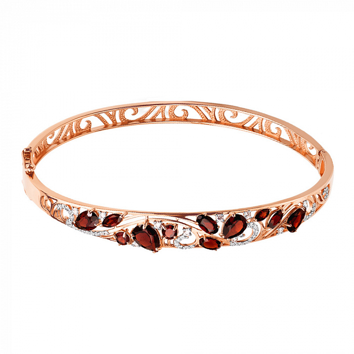 Вниманию покупателей представлено ювелирное изделие для изысканных дам, предпочитающих роскошь во всем. Это браслет «Нателла» из красного золота 585 пробы, эффектно усыпанный гранатами и фианитами натурального происхождения. Кроме драгоценной вставки, в модели интригует литой способ изготовления оправы и узорный орнамент на одной из сторон ободка. На запястье экземпляр будет сидеть надежно и комфортно. Этому способствует застежка-коробка. Замок исключает самопроизвольное растегивание. Чтобы его открыть нужно применить некоторую силу. Будьте уверенны, вы не утеряете столь дорогостоящее изделие. Кроме того модель имеет подобные по стиль оформления колечки, серьги и колье.