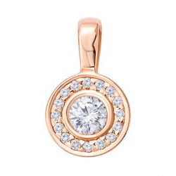 Золотой подвес Доминика – это настоящая роскошь для любительницы чистых бриллиантов. Украшение сияет удивительными бликами, которые не может повторить ни один другой драгоценный камень. Подвес получил идеально круглую форму, и небольшой размер, который хорошо смотрится на открытом декольте. Носить такое изделие можно на короткой золотой цепочке или каучуковом, кожаном чокере. По изделию выложена тонкая изящная бриллиантовая дорожка из мелких камешков, а центр украшен самым крупным сверкающим бриллиантом, в искры которого влюбится даже самая искушенная натура.
